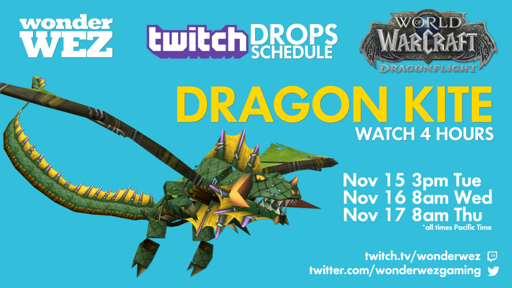 First up, starting next week you’ll be able to unlock the Dragon Kite battle pet (originally from the TCG) by watching 4 hours of your favorite WoW streamer between Tuesday November 15th at 3:00pm PST through Friday November 18th at 11:59pm PST.